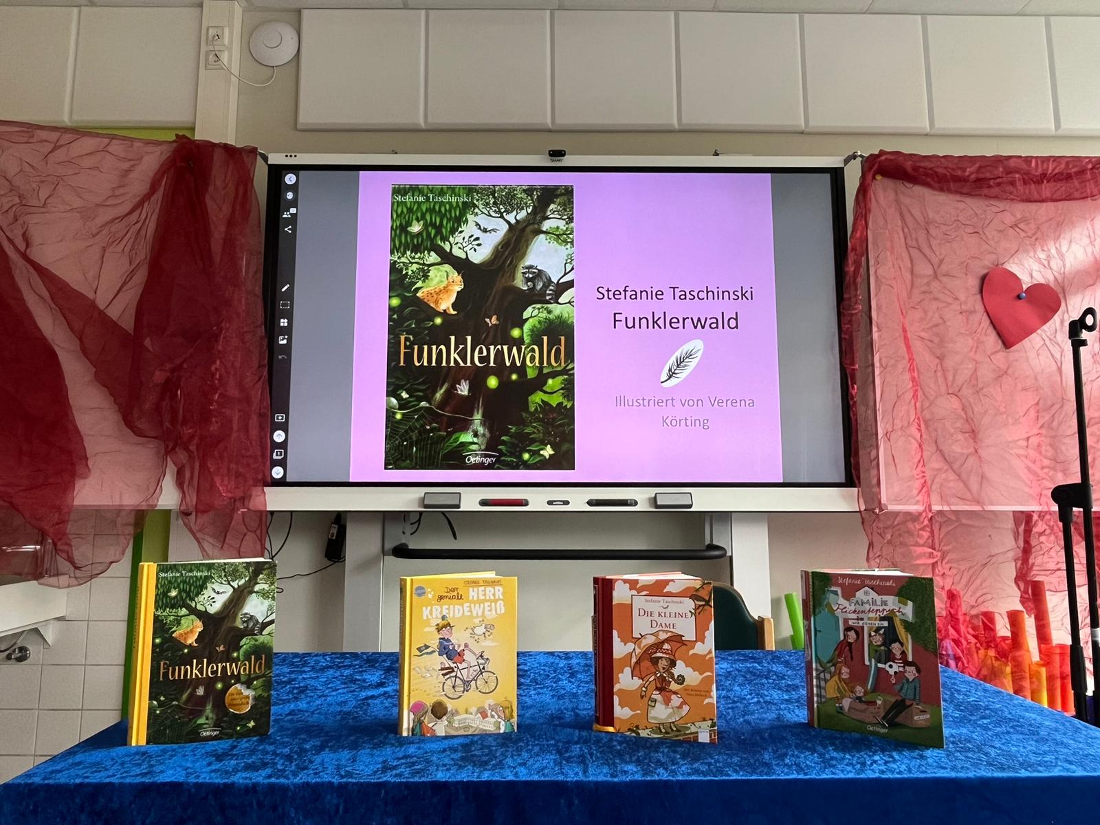 Am Dienstag lauschten die Kinder der ersten Klassen der Geschichte von Der kleinen Dame, bevor im Anschluss die Zweitklässler Den fantastischen Herrn Kreideweiß kennenlernen durften. Am Donnerstag waren dann die dritten und vierten Klassen an der Reihe. Sie tauchten gemeinsam mit der Autorin in die Welt des Funklerwalds ein.