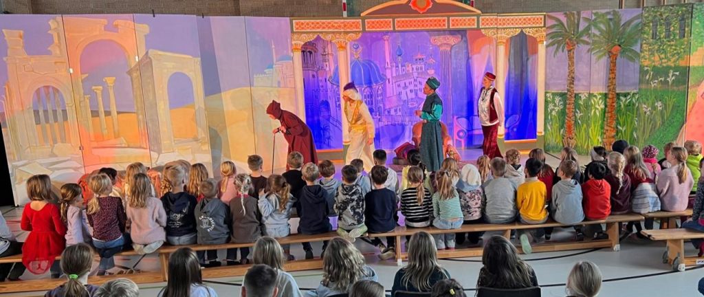 Am vergangenen Mittwoch wurde in unserer Turnhalle das Theaterstück „Kalif Storch“ als diesjähriges Weihnachtsmärchen aufgeführt. Die Turnhalle verwandelte sich dafür in eine kleine Bühne, auf der das Ensemble die Geschichte lebendig und humorvoll präsentierte.